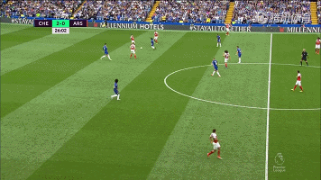 蓝军通过中路的尝试,很快印证萨里的对于球队中场能力自信。在这个基础上,切尔西快速取得进球。图中回合,中场传递之后,若日尼奥快速一脚向前找到前插的阿隆索,中路佩德罗无人盯防完成进球。这个回合就可以看出,枪手在节奏和速率上是跟不上切尔西的。