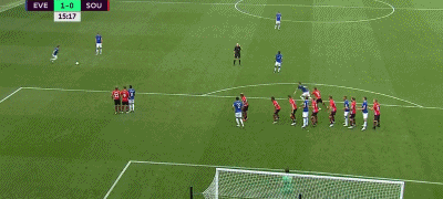 第15分钟,埃弗顿打出精彩任意球团队配合,贝恩斯任意球短传找到弧顶处的施耐德林,后者不停球巧妙直塞禁区,沃尔科特插上挑射破门,1-0!