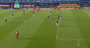 第19分钟,皮克福德开大脚,勒温头球摆渡,伯纳德拿球后晃出空档16码处右脚低射,球飞入左下角,曼联0-1落后。