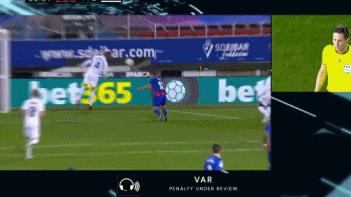 这一幕发生在比赛第81分钟,当时埃瓦尔左路传中,禁区内的拉莫斯起跳后没能顶到后,而他身后的埃瓦尔前锋武藤嘉纪头球,足球恰好打在拉莫斯的右手手臂上。埃瓦尔球员向裁判投诉拉莫斯手球犯规,但经过VAR回放后,主裁判却并未判罚点球,反而到场边警告了抗议的埃瓦尔主帅。
