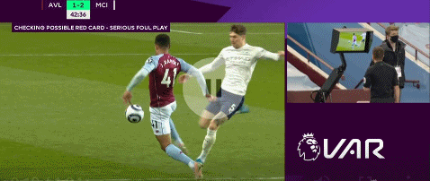 第43分钟,斯通斯防守中踢倒拉姆齐,主裁判起初出示了黄牌,不过在观看了VAR后,裁判直接将斯通斯罚下。曼城在上半场就只剩10人应战。
