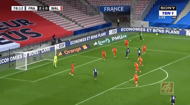 第70分钟,姆巴佩回做,本泽马拿球一脚左脚低射被防守球员挡出底线。第76分钟,布鲁克斯主罚禁区前的任意球直接射门被人墙挡出。第79分钟,孔德右路传中,本泽马胸部停球后一脚抽射打中立柱弹出,登贝莱补射将球打进,法国3-0威尔士。