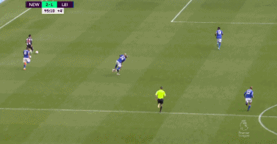 第90+5分钟 ,吉马良斯禁区内鱼跃冲顶破门!纽卡斯尔压哨绝杀!纽卡斯尔2-1莱斯特城!