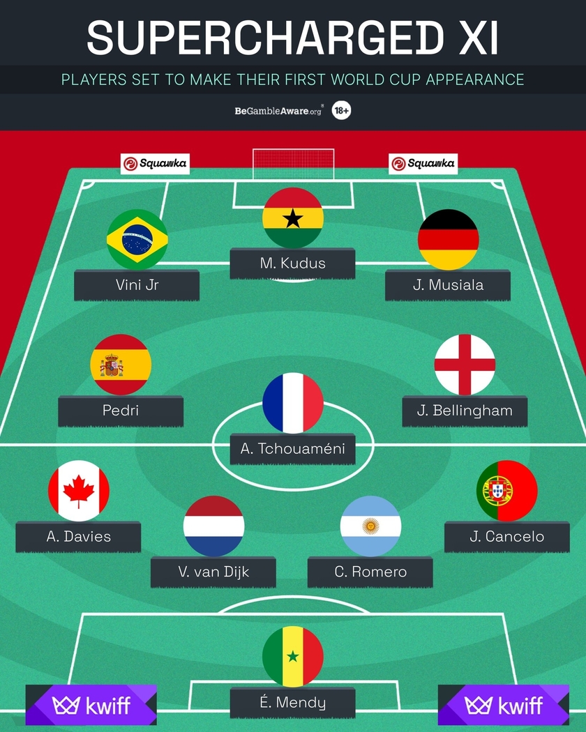 nba直播讯 《Squawka》评选出了首次参加世界杯最佳阵,维尼修斯、穆西亚拉、佩德里、贝林厄姆在列。
