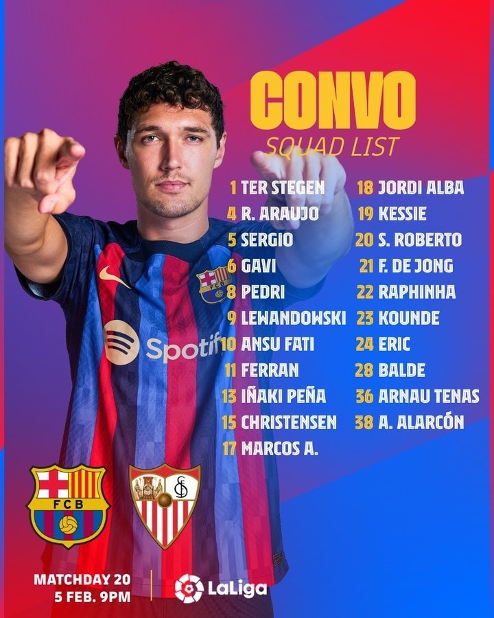 nba直播讯 北京时间2月6日周一凌晨4点,巴萨将在西甲第20轮主场迎战塞维利亚,今天巴萨公布了比赛大名单。