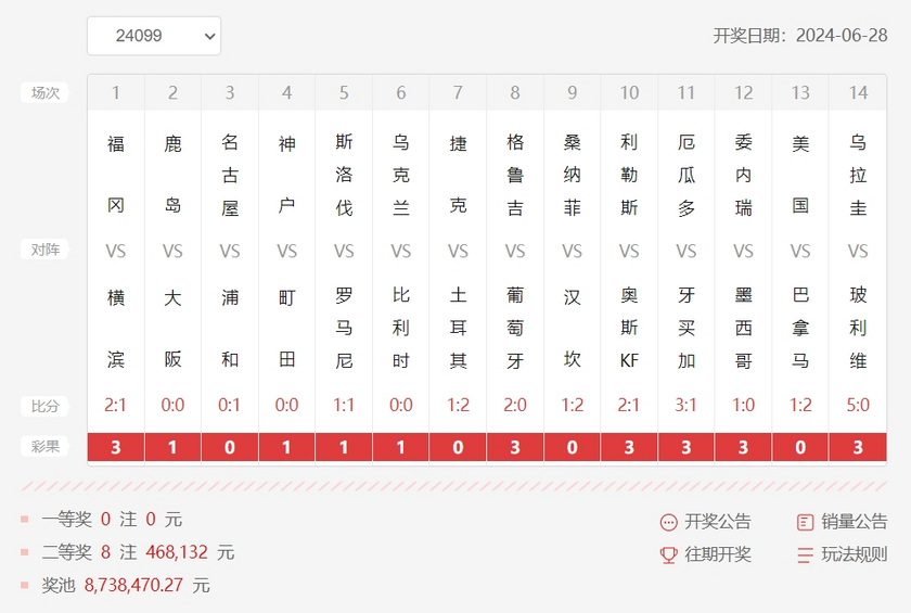 北京时间6月28日,胜负彩第24099期结束了全部14场比赛的争夺。本期胜负彩由日系赛事打响头炮,福冈2-1击败横滨就已经令人玩味,欧洲杯战况方面,斯洛伐0-0罗马尼,这场和局数据不断下滑,相信不少球迷朋友已经单挑和局,形成胆材。同小组乌克兰(和局4.05倍)也是0-0与比利时互交白卷,遗憾的是乌克兰只能够接受出局的命运,这也是斯洛伐0-0罗马尼杰出表演的结果。当然葡萄牙0-2格鲁吉亚(格鲁吉亚胜7.35倍),赛果看起来冷门,但我想不少球迷朋友也会看穿剧本,毕竟葡萄牙已经晋级,而格鲁吉亚队中不少球员跟C罗有着千丝万缕的关系。反而令人意外的是美国1-2巴拿马,独造巴拿马胜8.05倍赛果。委内瑞拉也有胜3.85倍1-0击败墨西哥的雄心壮举。