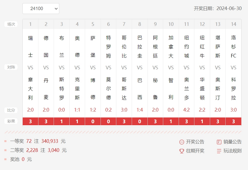 北京时间6月30日,胜负彩第24100期结束了全部14场比赛的争夺。本期胜负彩赛果也是难以猜测,第一场瑞士就让我们刮目相看,最后瑞士(3.17倍)2-0轻取意大利,顺利晋级。不知道此时此刻,意大利主教练是否会懊恼自己的变阵失败?另一场德国则是2-0带走丹麦。德国若不是错失太多机会,其实2-0的赛果还算保守了。挪威超方面,强队布兰居然0-0被斯特罗逼和(5.15倍),不知道这场大家防了一手平局没有。而美洲杯方面今期也算良心了,阿根廷,巴西,哥伦比亚都轻松打出胜利。美职方面依旧存在难点赛事,纽约红牛2-2华盛顿(4.45倍),这场略坑!