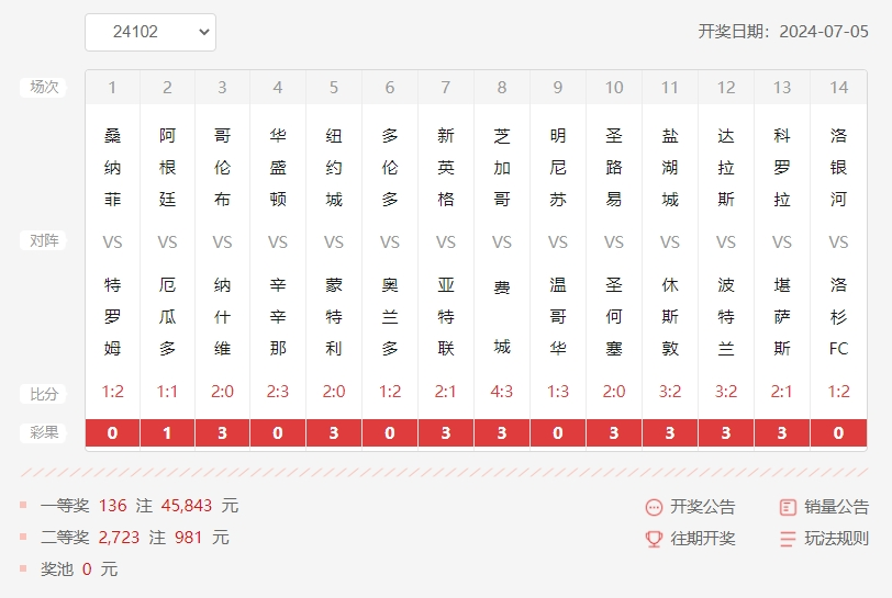 北京时间7月5日,胜负彩第24102期开奖结果揭晓。本期胜负彩难度颇高。第一场挪威超估计已经难倒不少球迷朋友了,桑纳菲1-2特罗姆瑟(2.97倍),这一场0相当难防。第二场美洲杯更不用说了,厄瓜多尔末期绝平,伤害了多少阿根廷的坚实粉丝!美职联方面,芝加哥虽然取胜,但是4-3的比分确实让不少观众朋友们汗颜,毕竟去往芝加哥的过山车可不好坐。最后洛杉矶德比战,由洛杉矶FC笑到最后。总体来讲这一期的胜负彩北欧次级联赛比较难猜,美洲杯也算爆了冷门。但是之前一直有难度的美职联反而出了比较多的正路。