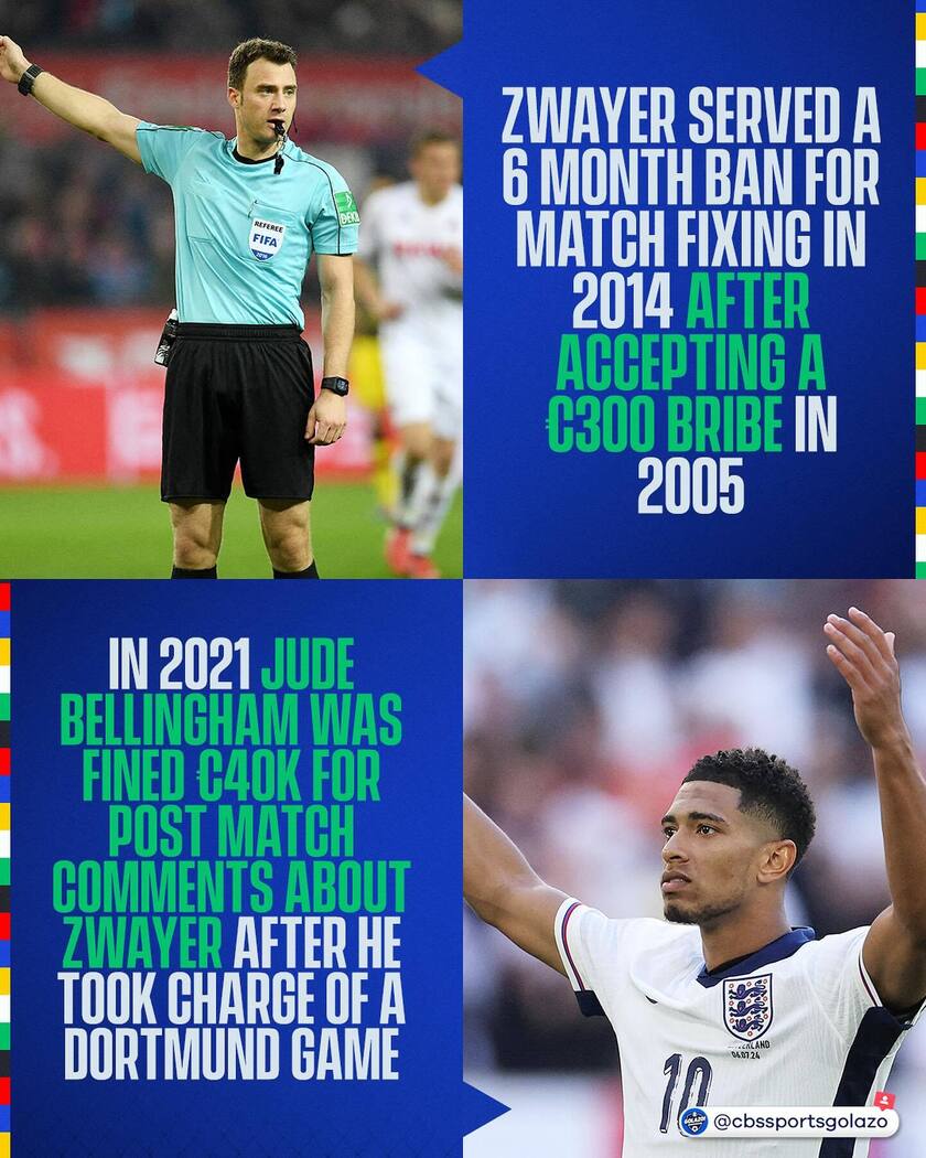 赛后贝林厄姆公开指控茨瓦耶:“你让你一位曾经操纵过比赛的裁判来执法德国最重要的比赛,你还能指望什么呢?”贝林厄姆因为这番言论被罚款4万欧元,而茨瓦耶则被停哨了2个月。