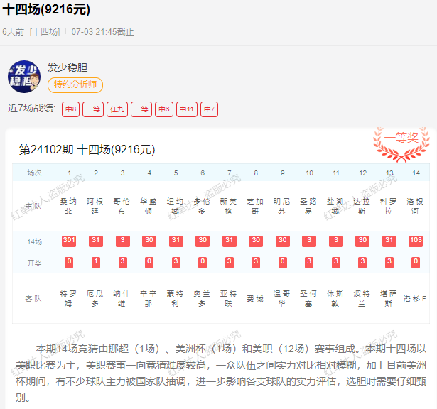 发少稳胆14场胜负彩24105期,发少今日继续奉上本期胜负彩游戏焦点赛事赛果精心预测,希望能够对广大彩民有所帮助,欢迎大家长期关注支持!