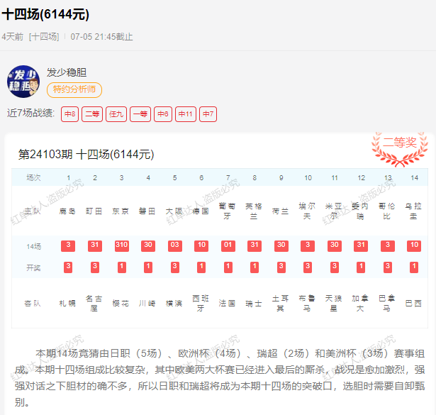 本期14场竞猜由天皇杯(10场)、欧洲杯(2场)和美洲杯(2场)赛事组成。本期胜负彩以天皇杯为主,竞猜难度比较大,毕竟日本赛事本身赛果就比较难预测,还是天皇杯这样的爆冷温床,选胆难度不小。加上欧洲杯和美洲杯的4场半决赛比赛,都是强强对话,胆材难觅,本期胜负彩相信奖金成色不低,有能力的彩民不妨放胆一试。
