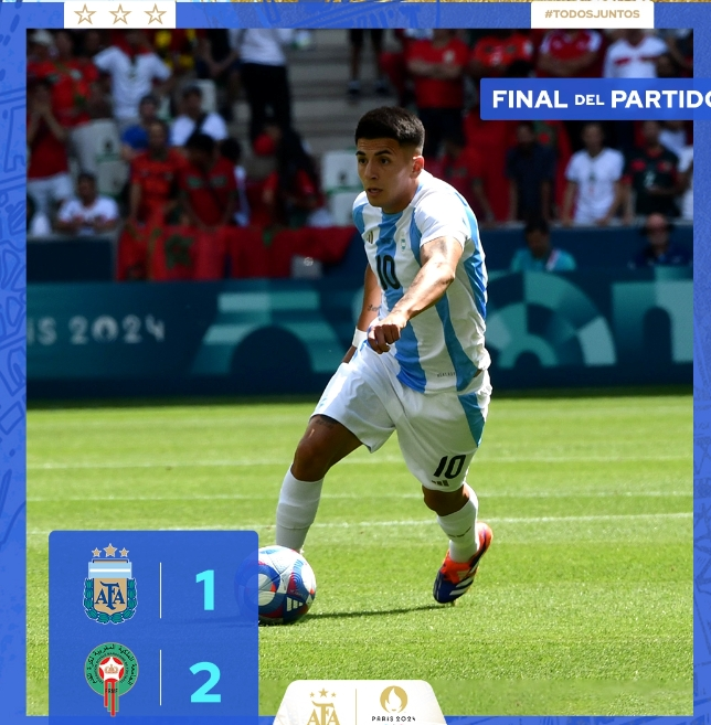 nba直播讯 07月25日 北京时间7月24日晚21时整,2024年巴黎奥运男足小组赛B组第1轮展开角逐,阿根廷U23对阵摩洛哥U23。上半场拉希米打破僵局,下半场索莱尔推人送点,拉希米点射梅开二度,西蒙尼三儿子朱利亚诺-西蒙尼替补扳回一城,阿尔瓦雷斯失单刀,下半场补时15分钟,比赛第106分钟梅迪纳绝平但是被VAR裁定无效(中断2小时后VAR确认进球无效)。因球迷扔鞭炮&冲场而中断,导致比赛中断2小时又重新回到球场踢了3分钟,最终阿根廷1-2不敌摩洛哥!阿根廷下轮将对阵伊拉克,摩洛哥将迎战乌克兰。