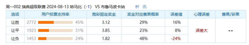 这场比赛中,选择 布鲁马波卡纳不败的球迷偏少了,只有32%的球迷选择了让负选项这场比赛中,选布鲁马波卡纳不败的球迷偏少了,只有32%的球迷选择了让负选项,大家都看好哈马比能取得比赛的胜利并且有可能是一场大胜,但是这也与奖金对应赛果概率的48%相差了24%,大家看好哈马比其实也很正常,哈马比在瑞典超联赛上赛季排名第七,积44分。在瑞典超联赛本赛季排名第三,积31分。身价2360万欧元,在瑞典超联赛里身价排名第二,实力比客队要好上不少,两支球队从市场形象、球队实力定位来看,主场作战的哈马比还是占据热度的一方。