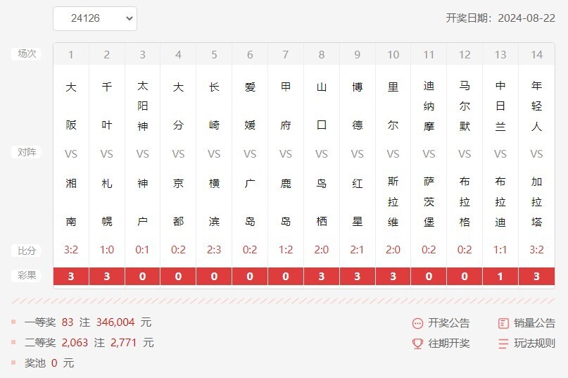 nba直播讯 北京时间8月22日,胜负彩第24126期开奖结果揭晓。本期胜负彩日系比赛成为焦点,欧冠联赛成为主流。第一场比赛就已经上演惊天剧本,大阪最终3-2湘南,日系比赛只要不到最后一刻,也很难讲胜负花落谁家。本以为日职联赛已经难以竞猜,没想到,日皇杯的剧本更让人摸不着头脑,这样下去小日子的粉丝将会所剩无几呀!反而欧洲赛事的赛果多为正路,博德闪耀,里尔都能够在自己的主场拿下对手,而马尔默跟加拉塔萨雷虽然输球,但上述两支所谓的强队因为在赛前得不到数据的认可,输球也是情理之内,估计不少球迷朋友也防了一手!