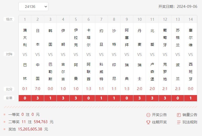 nba直播讯 北京时间9月6日,胜负彩第24136期开奖结果揭晓。本期胜负彩中以国家队比赛为主,其中国足打出亮眼比分,中日巅峰对决,国足0:7憾负日本!!!同时我们也看到亚洲范围内其他球队已经崛起,第一场巴林1-0绝杀澳大利亚,巴勒斯坦0-0逼和韩国,印尼1-1逼和沙特。不得不说亚洲足球水平全面提升,反观国足还在大清国超级联赛进行洋务运动,而日本足坛在明治维新下,已经成功脱亚入欧,北洋军阀被联合舰队赠饮七喜也在意料之内!!!欧洲列强方面,丹麦,葡萄牙轻容拿下各自对手,反而西班牙开始心高气傲,居然0-0与塞尔维亚激战成和。