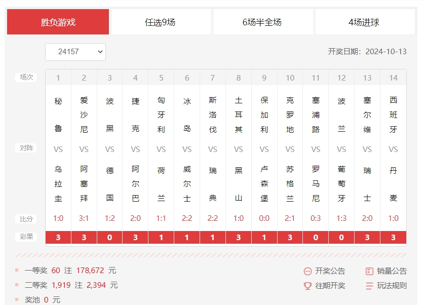 nba直播讯 北京时间10月13日,足彩第24157期开奖结果揭晓。这是最好的时代,也是小胜的时代!