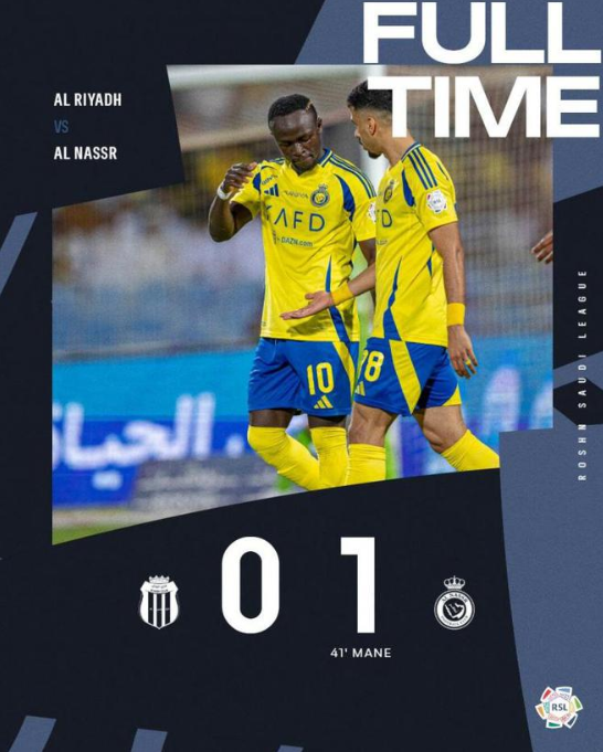 全场比赛结束,利雅得胜利凭借着马内在上半场的进球,在客场以1-0击败了利雅得体育。