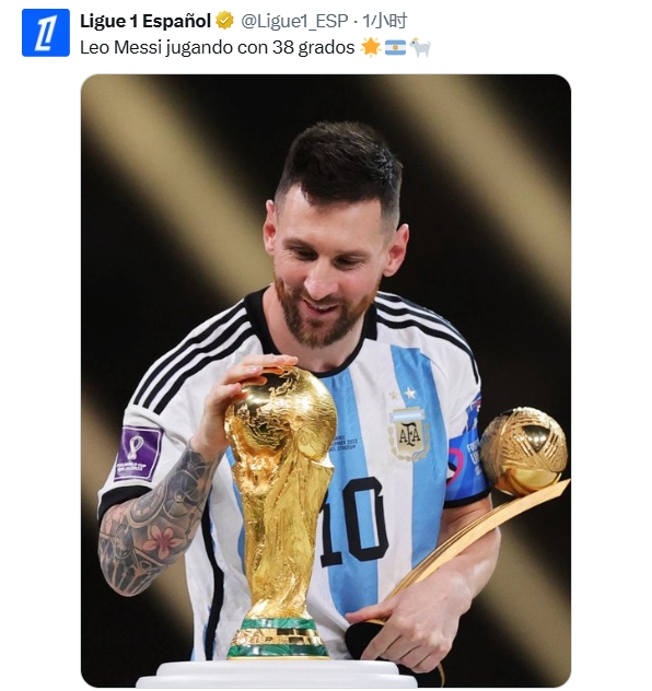 对此,法甲联赛的西班牙语官方推特迅速作出回应,并附上了一张梅西在卡塔尔世界杯上比赛的照片,配文写道:“梅西在38度高温下依然踢球并赢得了世界杯。”