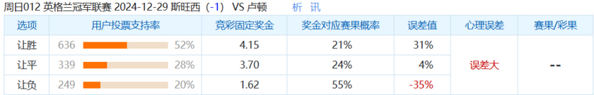 本场比赛中,选择卢顿让球负的球迷明显偏少了,只有20%的球迷选择让球胜选项,这场比赛中,大家都看好主场的斯旺西会赢得这场比赛,不看好卢顿能在客场保住分数,但是这也与奖金对应赛果概率的55%相差35%。