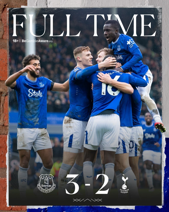英超第22轮,埃弗顿对阵热刺。上半场,卡尔弗特-勒温和恩迪亚耶在伊德里萨-盖伊的助攻下相继破门,热刺格雷不幸自摆乌龙。下半场,库卢塞夫斯基为热刺扳回一城,里沙利松终场前破门但无力回天。最终,埃弗顿3-2战胜热刺。