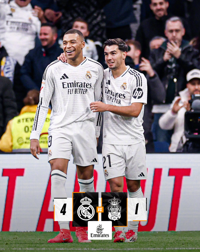 西甲第20轮,皇马主场战拉斯帕尔马斯。上半场,法比奥-席尔瓦闪击,姆巴佩双响并且一球被判无效,卜拉欣-迪亚斯破门,罗德里戈造点并助攻自己破门。下半场,弗兰-加西亚助攻罗德里戈再下一城,最终皇马4-1击败十人拉斯帕尔马斯,登顶西甲。