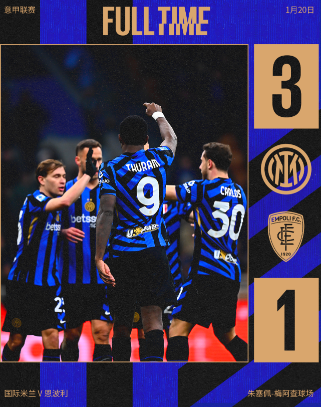 意甲第21轮,国米对阵恩波利,上半场双方机会寥寥。下半场,劳塔罗世界波打破僵局,邓弗里斯头球扩大优势,恩波利扳回一城后,小图拉姆冷静破门锁定胜局。最终,国米3-1击败恩波利。