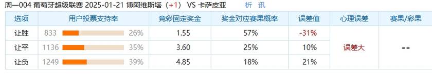 本场比赛中,选博阿维斯塔获让球胜的球迷偏少了,只有26%的球迷选择获让球胜选项,这场比赛中,大家都看好客队的卡萨皮亚会赢得这场比赛,不看好博阿维斯塔能在主场保住不败,但是这也与奖金对应赛果概率的57%相差31%。