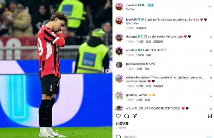 他也在赛后通过社媒晒出自己进球后的庆祝照,并配文:“谢谢你们的热烈欢迎,圣西罗❤️🖤@AC米兰俱乐部”。