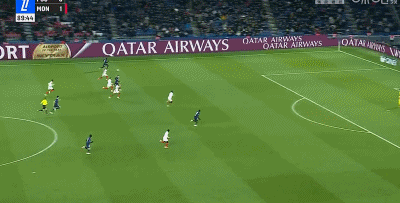 第90分钟,巴黎杀死比赛!反击机会门德斯左路下底横传门前登贝莱推射破门,巴黎4-1摩纳哥。