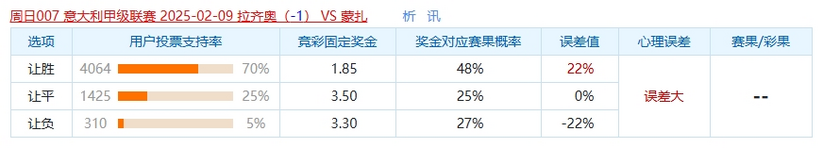 本场比赛中,选拉齐奥让球负的球迷偏少了,只有5%的球迷选择让球负选项,这场比赛中,大家都看好主队的拉齐奥会赢得这场比赛,不看好蒙扎能在客场保住不败,但是这也与奖金对应赛果概率的27%相差22%。