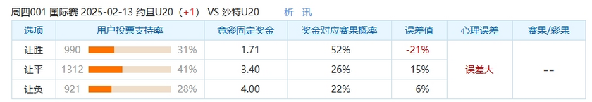 本场比赛中,选约旦U20获让球胜的球迷偏少了,只有31%的球迷选择获让球胜选项,这场比赛中,大家都看好沙特U20会赢得这场比赛,不看好约旦U20