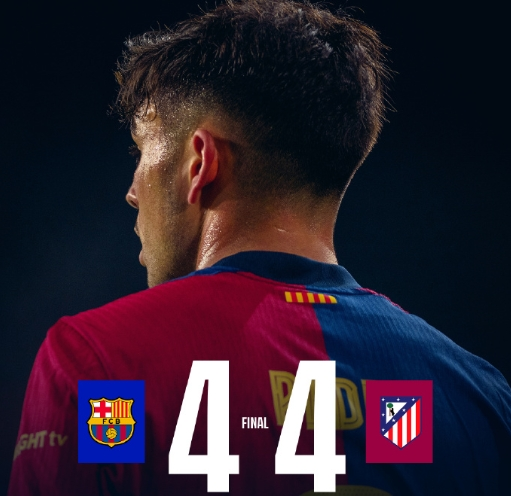下半场马竞连续错过2次得分机会,反倒是巴萨在第74分钟亚马尔下底助攻莱万扩大优势;马竞自然不甘心输球。第84分钟,科雷亚倒三角回敲,略伦特抽射将比分缩小;第93分钟,孔德回防意外滑倒,利诺无人盯防横传,瑟洛特禁区推射破门完成绝平!2队各进4球,结束这场精彩大战。