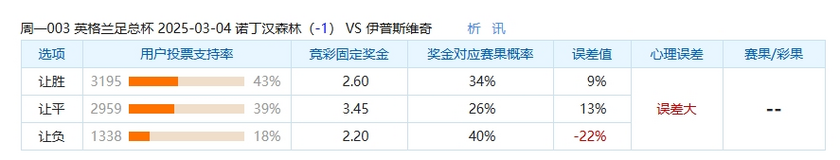 本场比赛中,选诺丁汉森林让球负的球迷偏少了,只有18%的球迷选择让球负选项,这场比赛中,大家都看诺丁汉森林主场会赢得这场比赛并且可能大胜这次比赛,不看好伊普斯维奇能客场保住数据,但是与奖金对应赛果概率的40%相差22%,数据误差较大。