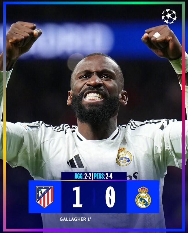 在欧冠1/8决赛次回合的焦点战中,皇家马德里与马德里竞技上演了一场惊心动魄的同城德比。比赛开场仅27秒,马竞的加拉格尔便闪击破门,为球队取得梦幻开局。下半场,姆巴佩制造点球机会,但维尼修斯主罚打飞,错失扳平良机。90分钟战罢,双方总比分2-2进入加时赛。加时赛中,两队均未能改写比分,比赛进入点球大战。点球大战中,马竞的阿尔瓦雷斯因二次触球违例被判无效,而巴斯克斯和略伦特相继失点。最终,皇马以4-2赢得点球大战,总比分6-4淘汰马竞,成功晋级欧冠8强。