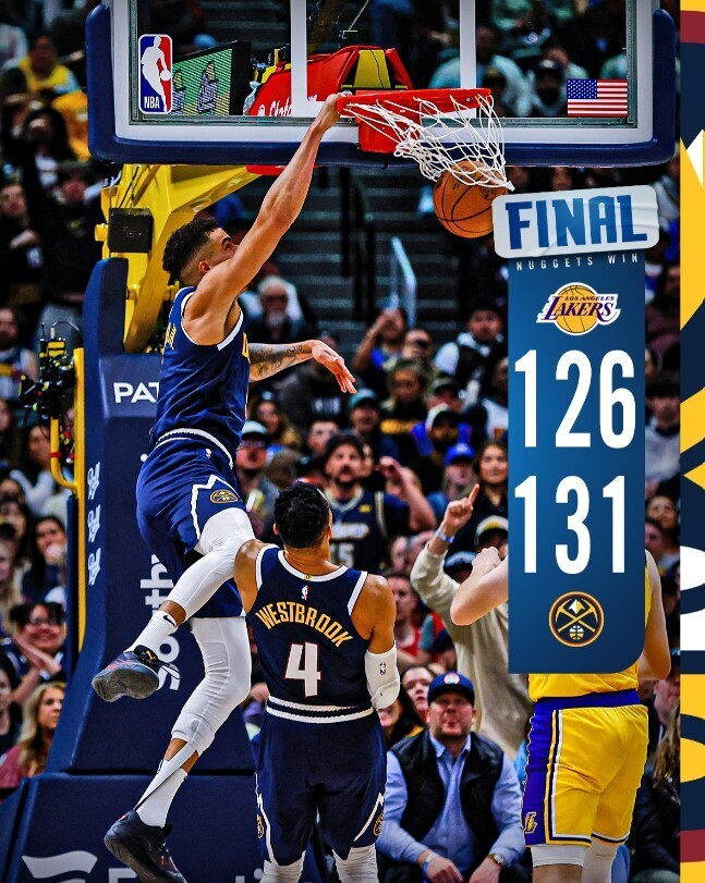 尽管湖人伤兵满营,里夫斯首节砍下12+5+7的全能数据,布朗尼也在轮换阶段贡献关键表现,帮助湖人首节狂砍40分抢占先机。然而,掘金次节全面苏醒,打出25-12攻势反超比分。下半场,掘金一度拉开两位数分差,但湖人凭借里夫斯的出色发挥轰出17-4高潮反超。末节双方交替领先,穆雷最后时刻命中关键三分,帮助掘金131-126险胜湖人,送对手四连败。