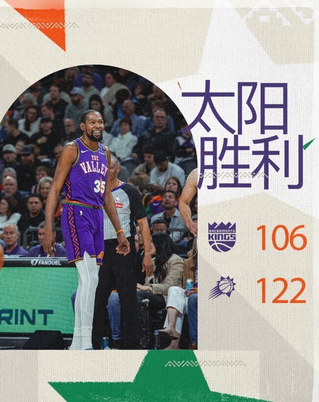 太阳开局由杜兰特和布克联手发力,琼斯连中三分帮助球队建立两位数优势。次节国王缩小分差,但太阳下半场连中三分重获领先,并凭借多点开花将分差拉开至20分以上。最终,太阳122-106轻取国王,主场轻松过关。