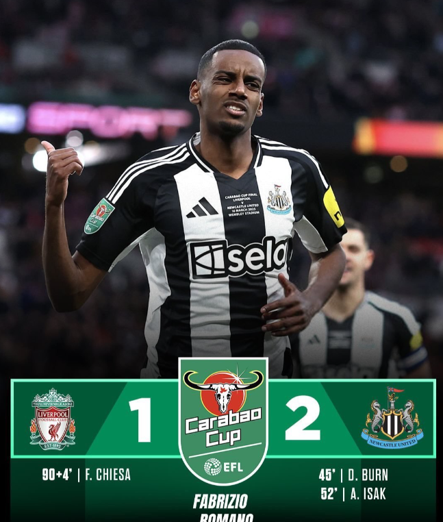 英联杯决赛,利物浦与纽卡斯尔联在温布利大球场展开激烈角逐。上半场,丹-伯恩凭借一记强力头球为纽卡斯尔联首开纪录,若塔错失扳平良机。下半场,伊萨克抓住机会破门,帮助纽卡扩大领先优势。尽管小基耶萨在补时阶段为利物浦扳回一城,但最终纽卡斯尔联以2-1力克利物浦,队史首次夺得英联杯冠军,创造了新的历史。