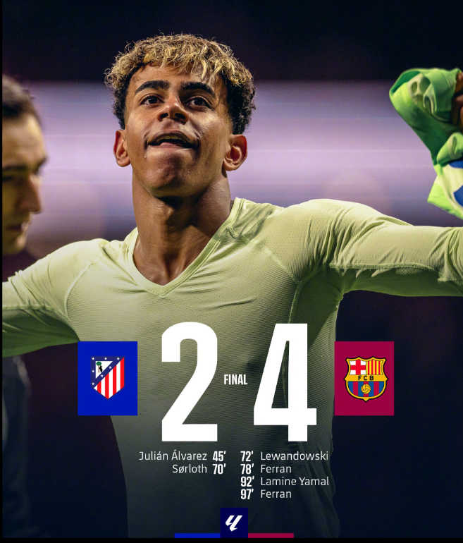 西甲联赛第28轮,马德里竞技主场迎战巴塞罗那。上半场,阿尔瓦雷斯打破僵局为马竞取得领先。下半场,瑟洛特的进球帮助马竞扩大优势,但随后莱万和费兰-托雷斯在6分钟内连入两球扳平比分。补时阶段,亚马尔的远射折射入网反超比分,费兰-托雷斯读秒阶段锁定胜局。最终,巴萨客场4-2逆转马竞,少赛一场的情况下登顶西甲积分榜。