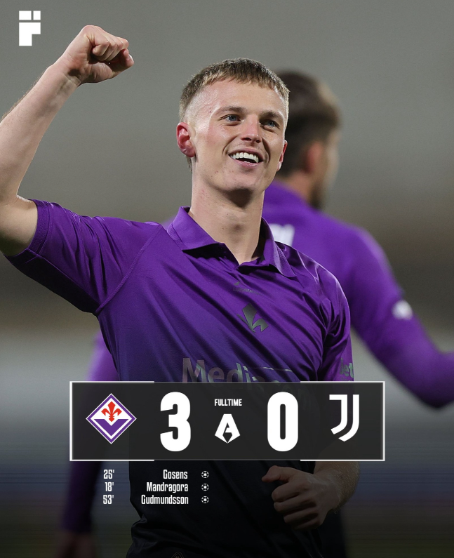 意甲联赛第29轮,佛罗伦萨主场迎战尤文图斯。上半场,戈森斯和曼德拉戈拉先后破门为佛罗伦萨取得领先。下半场,古德蒙德松的远射将比分锁定为3-0。尤文图斯遭遇两连败,且两场比赛丢7球未进一球,状态低迷。