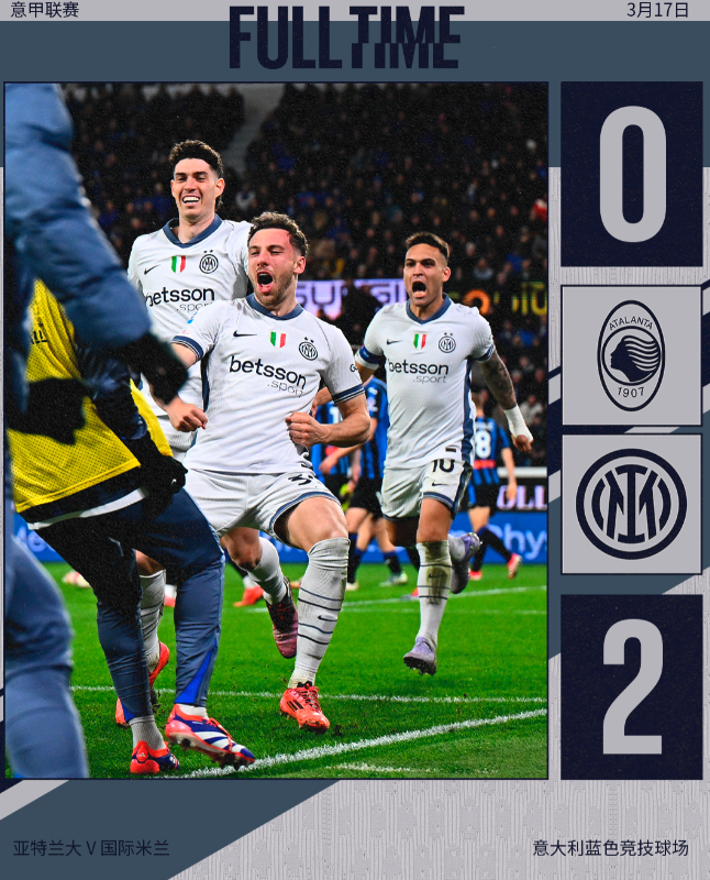 意甲联赛第29轮,国际米兰客场挑战亚特兰大。上半场,小图拉姆的单刀击中门柱。下半场,奥古斯托头球破门打破僵局,劳塔罗小角度劲射锁定胜局。最终,国米以2-0战胜亚特兰大,以3分优势领跑意甲积分榜。