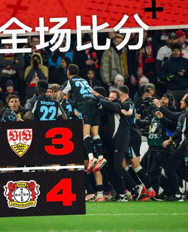 德甲联赛第26轮,斯图加特主场对阵勒沃库森。比赛中,德米罗维奇率先破门,米约助攻沃尔特马德扩大比分。弗林蓬和因卡皮耶为勒沃库森连追两球,但扎卡的乌龙球再次拉开分差。补时阶段,希克头球绝杀,帮助勒沃库森以4-3逆转斯图加特,展现了顽强的斗志。