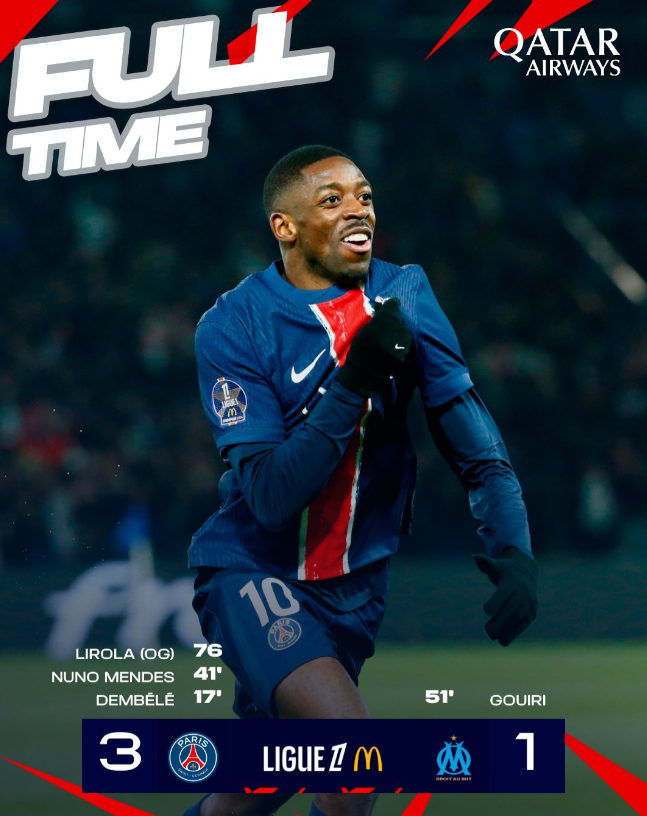 法甲联赛第26轮,巴黎圣日耳曼主场迎战马赛。比赛开始后,奥斯曼-登贝莱和努诺-门德斯先后破门为巴黎取得领先。古伊里为马赛扳回一城,但普尔-利罗拉的乌龙球让巴黎锁定胜局。最终,巴黎圣日耳曼以3-1战胜马赛,继续领跑法甲积分榜。