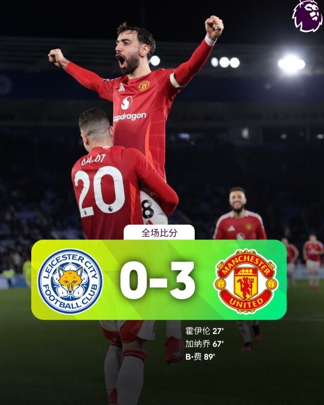 英超第29轮,曼联客场挑战莱斯特城。上半场,B费助攻霍伊伦低射破门,为曼联取得领先。下半场,加纳乔的进球因越位被判无效,但B费再次助攻加纳乔破门,随后达洛特精彩过人后助攻B费远射得手。最终,曼联3-0大胜莱斯特城,继续稳居联赛中游。