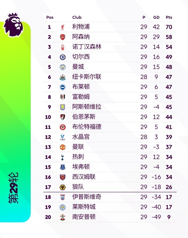 利物浦在英联杯决赛失利后,虽然三线受挫,但在英超联赛中仍以12分的优势领跑,专注联赛夺冠几乎已成定局。阿森纳在联赛中稳居第二,尽管夺冠无望,但他们将更多精力投入到与皇马的欧冠对决中。切尔西目前排名第四,仅领先曼城1分,争四大战异常激烈。曼联和热刺则分别排名第13和第14位(被球迷称为“1314组合”),尽管表现不佳,但由于降级区球队表现更差,两队暂时无需为保级担忧。
