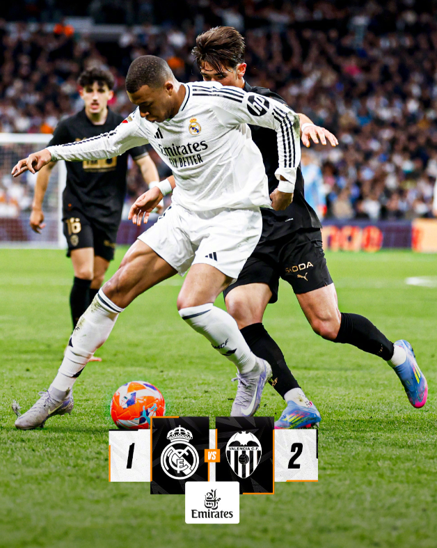 西甲第30轮,皇家马德里在伯纳乌对阵瓦伦西亚。第19分钟迪亚卡比头球破门因越位被VAR取消。第45分钟,姆巴佩造点但维尼修斯主罚被扑。第76分钟克罗斯角球助攻维尼修斯后点推射空门得手。补时阶段杜罗接加亚传中头球绝杀,瓦伦西亚2-1爆冷取胜。