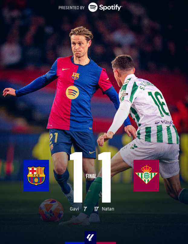 西甲第30轮,巴塞罗那主场迎战皇家贝蒂斯。第21分钟费兰-托雷斯右路传中,加维凌空垫射破门。第37分钟洛塞尔索开出角球,德索萨力压阿劳霍头球扳平。下半场莱万多次造险未果,最终比分定格1-1,巴萨领先优势达到4分。