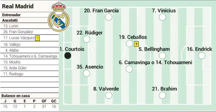 在左路方面,门迪仍然没有复出,加西亚将继续首发,吕迪格和阿森西奥有望继续搭档中卫。而在中场方面,贝林厄姆和近两场比赛表现稳定的塞瓦略斯,两人基本锁定首发,搭档人选将在楚阿梅尼和卡马文加之间产生。锋线上,维尼修斯基本确定首发,罗德里戈有可能轮休,布拉欣、恩德里克两人或将迎来首发机会。
