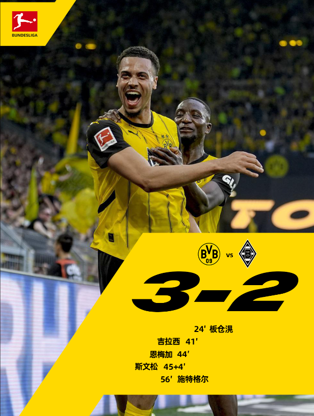 德甲联赛第 30 轮,多特蒙德主场迎战门兴格拉德巴赫。上半场板仓滉突破后推射破门,拜尔受伤离场,乌尔里希头球被判越位,格罗斯助攻吉拉西扳平,阿德耶米助攻恩梅加反超,吉拉西抽射被扑后斯文松头球补射得手。下半场恩梅加送点,施特格尔主罚命中。最终多特蒙德 3-2 战胜门兴格拉德巴赫。