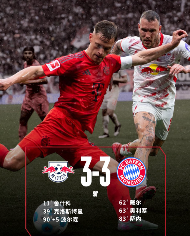 德甲第32轮上演进球大战,拜仁慕尼黑客场3-3战平RB莱比锡。谢什科和克洛斯特曼为主队建立两球优势,拜仁由戴尔、奥利塞和萨内连扳三球反超,但波尔森最后时刻绝平让拜仁夺冠推迟。