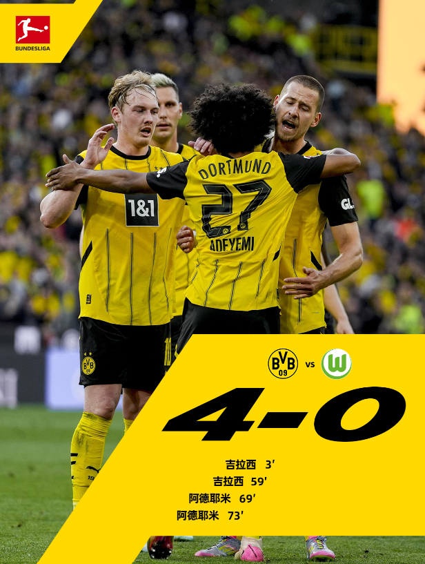 德甲第32轮另一场比赛,多特蒙德主场4-0大胜沃尔夫斯堡。吉拉西梅开二度,阿德耶米同样独中两元,帮助大黄蜂取得一场酣畅淋漓的胜利。